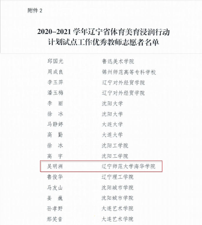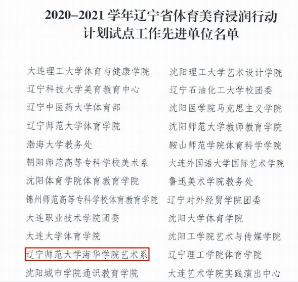 2021年11月23日,根据辽宁省教育厅下达的《关表彰2020-2021学年度辽宁省体育美育浸润行动计划试点工作先进单位和优秀教师志愿者的决定(辽教办【2021】415号)》,国产一区二区日本在线艺术系经推荐、审核通过,入选2020—2021学年度辽宁省美育浸润行动计划试点工作先进单位。艺术系教师吴明洲获“优秀教师志愿者”称号。
