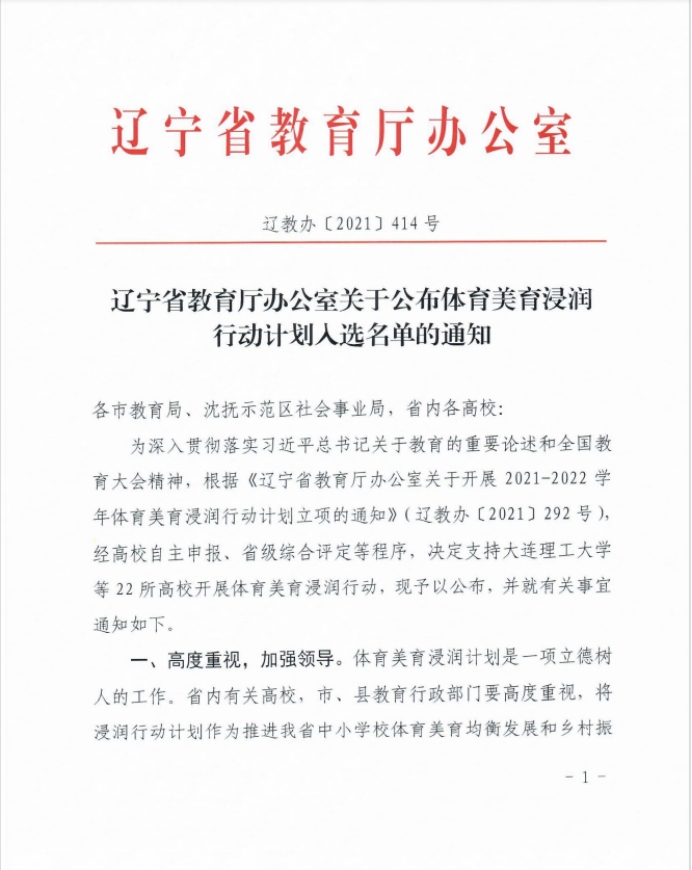 同时,《根据关于公布体育美育浸润行动计划入选名单的通知(辽教办【2021】414号)》,国产一区二区日本在线艺术系前期准备工作充足,计划全面,进展顺利,入选2021-2022年度体育美育浸润行动计划名单,立项成功。