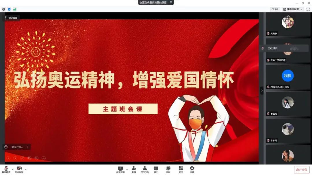 我校在2022年3月4日,为20级21级全体学生开展了开学第一课活动。受疫情影响,通过线上形式,组织学生开展爱国教育。帮助学生树立国家认同,培育爱国情怀。