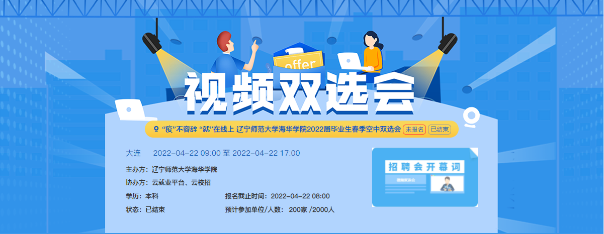 4月18日—4月22日,我校联合“云校招”平台以及腾讯会成功举办2022年第二场毕业生春季线上招聘会。本次线上招聘会共有来自省内外110家单位报名参会,提供就业岗位数量4497个,2022届毕业生以及2023届实习生积极参与。