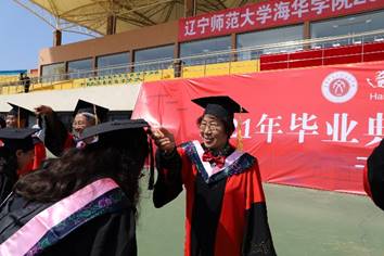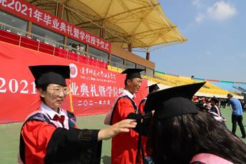 毕业典礼后举行了学位授予仪式。学校领导和学位评定委员会成员与2021届毕业生合影留念,并依次为毕业生正冠拨穗。