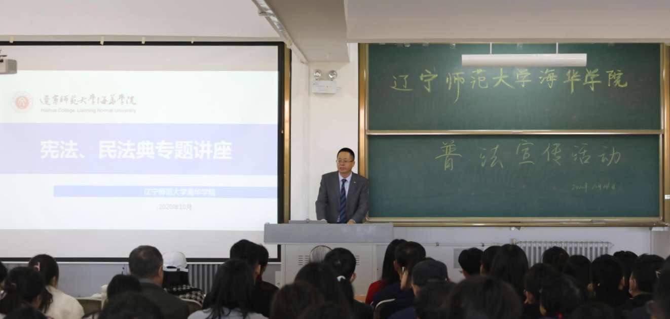为全面贯彻落实辽宁省教育厅、辽宁省司法厅《关于组织开展2020年度全省教育系统宪法民法典学习宣传教育活动的通知》,增进广大师生对宪法、民法典的理解,10月14日下午,国产一区二区日本在线举行了宪法、民法典专题学习讲座,特邀法律系主任赵晓光教授和吴镇洲老师做了“深入学习宪法,坚定四个自信,为实现中华民族的伟大复兴而奋斗”和“民法典带来的法治新时代风貌”的普法学习讲座,学院领导谷春祥和王树海出席了本次讲座,学院全体党员以及“青马工程”团学骨干培训班学员共同参加讲座。本次讲座由院长助理王树海主持。