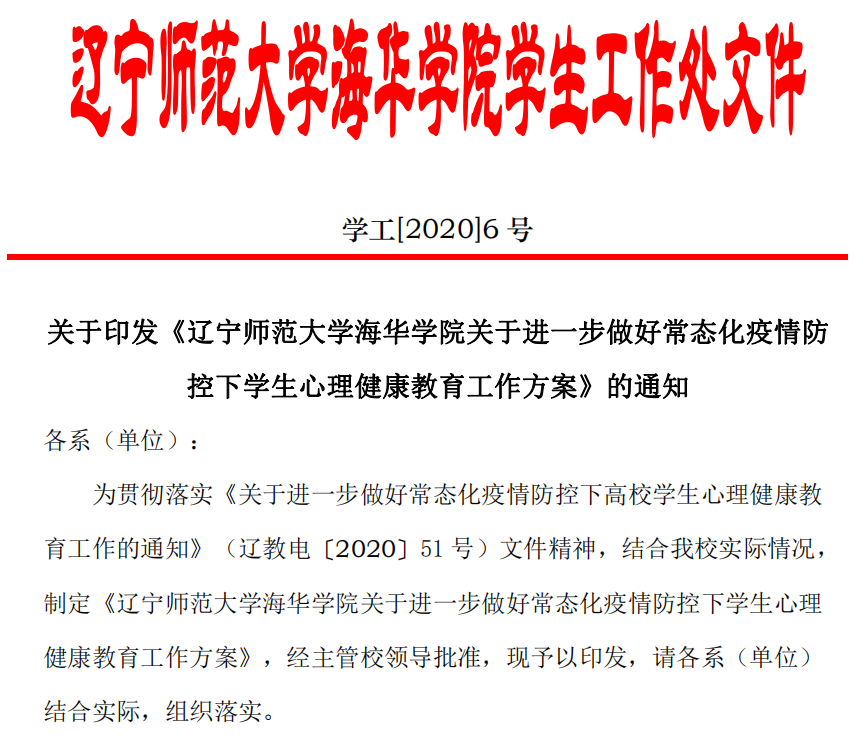为进一步做好常态化疫情防控下我校大学生心理健康教育工作,学生处组织各系认真贯彻执行《国产一区二区日本在线关于做好常态化疫情防控下学生心理健康教育工作方案》学工【2020】6号文件。