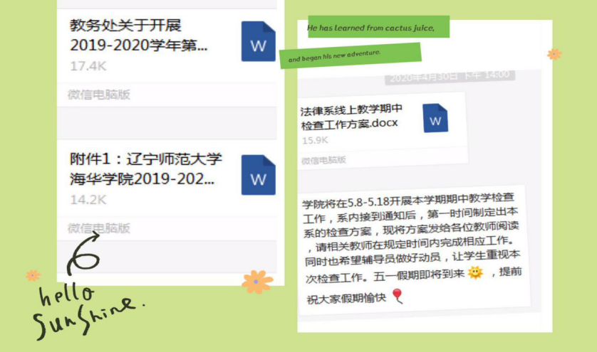 法律系的各个任课教师对此次检查工作给予了高度重视和积极配合,通过及时对教学经验的总结与分享,各位任课教师相互学习、积累经验、共同进步。此外,为了配合各位任课教师能够更好地完成线上教学任务,保障学生们能够按时上课、认真完成课后作业,法律系辅导员老师对各年级学生的出勤情况、学习状态以及课堂纪律等进行经常性的抽查。通过检查发现,法律系教学工作整体进行顺利,平稳有序。