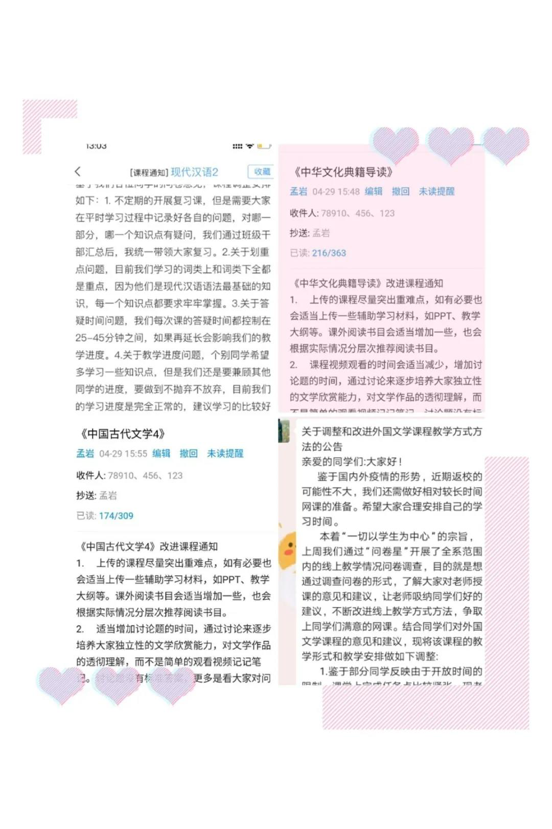 线上教学以来,中文系多次召开线上教学视频会议,努力确保教学质量,但一些细节问题还是会影响着线上教学的质量。调查问卷活动结束后,中文系第一时间召开视频会议,研究部署线上教学整改措施的落实。目前,各位教师“以学生为中心”,已将线上教学整改落到实处,通过网上课堂“通知”,向学生公告了课程的教学形式和教学安排的调整情况。